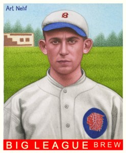 Our second painting shows hurler Art Nehf in the Brave’s home uniform used from mid 1915 through 1920. Nehf pitched for the team, usually quite well, from 1915 through part of the 1919 season. This uniform style has an early, simplified version of the Indian head prominently placed over the left breast. The red and white head, encircled by dark blue, must have been quite difficult to make out at any distance. I’m not familiar with many cards from that era showing this uniform, and none in color. As for Nehf, his career spanned 15 years, over which he accumulated a very satisfactory 184-120 record.