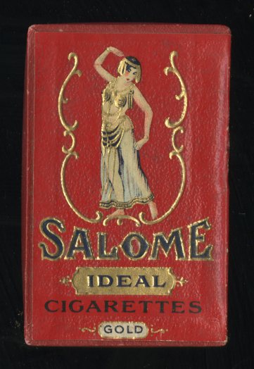 Here’s another fine addition to the box collection, this time a small one (3″ x 1 7/8″). The brand was called “Salome”, after the biblical temptress of the same name. The original Salome was the daughter of Herodias (AD 14-72). The story of her seductive “dance of the seven veils” before King Herod was covered by Gospel writers Mark and Matthew. Apparently Herod was so taken with her belly dancing that he offered her anything that she wanted in the world. Salome, not shy in her demands, required the head of St. John the Baptist. She kissed it when it was presented to her. As far as I know, this box represents Salome’s first advertising gig.