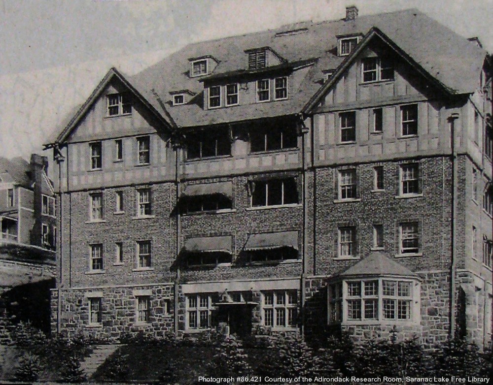 Santanoni apts c mathewson    Santanoni Apartments 1930s    floor plan santanoni apts 1914   Two contemporary images of the luxurious Santanoni Apartments in Saranac Lake, New York. Mathewson had moved to Saranac to take advantage of the nearby tuberculosis treatment center and sanatorium. The final image is of the floor plan to his apartment. Old teammate Larry Doyle, afflicted in 1942 with the same disease, also made his way to Saranac. He stayed at the Trudeau Sanitarium a full twelve years, until it closed in 1954 with the introduction of effective antibiotics. He was the last patient to leave, walking off the grounds.