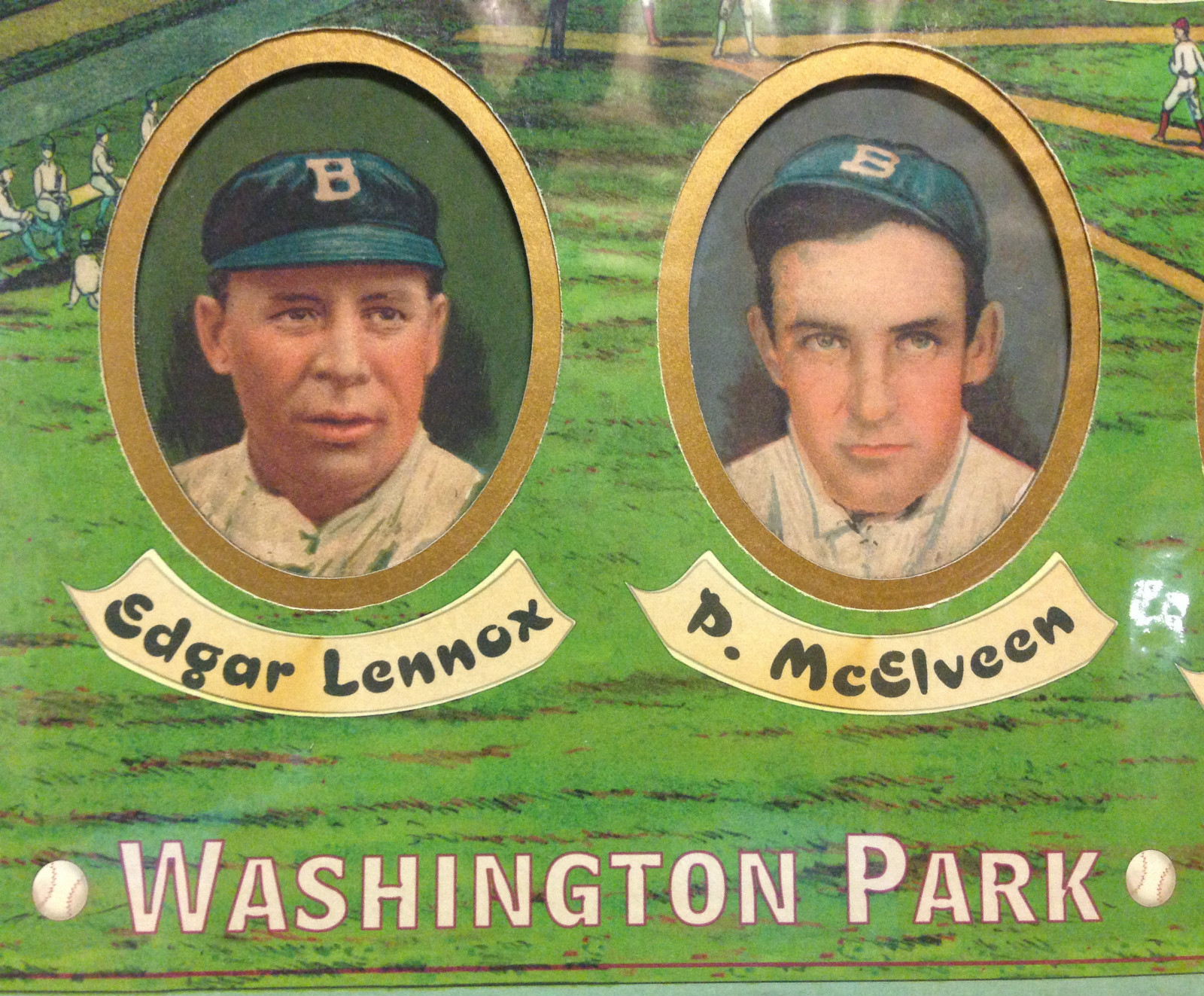 Doing the Brooklyn team display was a great time. The background was taken from a late 19th century poster and made a perfect backdrop for the player portraits. Everyone loves the old Brooklyn uniforms and we have two different versions appearing. Plus, this display has some of my favorite players-Zack Wheat, Nap Rucker, Edgar Lennox and Wild Bill Dahlen.