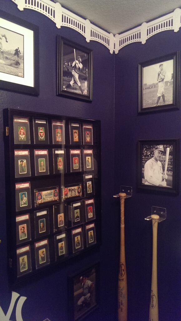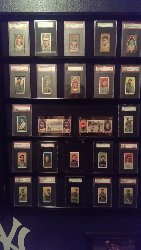 Jim McFarland of Florida has a great day career, more on that another time. His evenings, though, are filled with his other passion–as the curator of his own personal Hall of Fame. Jim’s grandfather, a past part-owner of the Cincinnati Reds, shared a portion of his personal mementos with Jim, who has collected ever since. Recently Jim sent photos of his mouth-watering displays of cards and memorabilia and I would like to share them with you. Note the Helmar cards (Jim is a big fan) mixed in with his other favorites such as a T206 Cobb. Thanks for the photos, Jim! (click to enlarge)