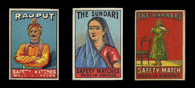 These examples of Swedish matchbox covers for the Indian market share the design element of a red stripe filled with bold text.