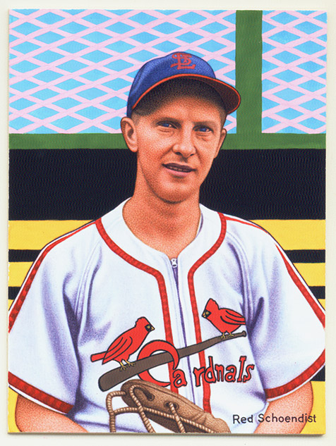 I’m really excited that the art for our new series of players from the 1950’s is coming along so well. This one of Cardinal HOFer Red Schoendist was just completed. There is some nice detail in this painting and collectors often comment about that. You can credit the artist, Sanjay Verma, for that and his tiny squirrel hair brushes. Very nice!