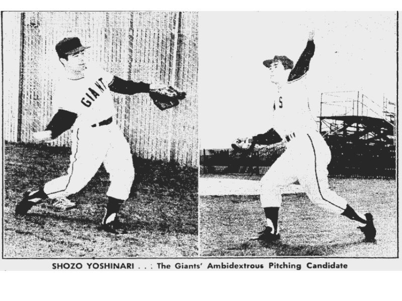 The man they called “Yoshi” had long sideburns and a slim build. When he went to the mound for his work, Yoshi brought two gloves, placing one on his non-pitching hand and tucking the other glove in his back pocket. He was unusual in that he tossed underhand from his right arm and overhand with his left. By some accounts, his left-handed slants were more difficult to pick up, diving down and in on lefty batters. Yoshinari was a natural left-hander, but in high school in Japan he suffered a sore arm. Not wishing to lose his place on the team, he taught himself to pitch right-handed while his left arm mended. After a stellar performance as a high school pitcher, his professional career in Japan was not newsworthy, and he was released. That’s when the Giants took note of him, through former pitcher Masanori Murakami, who pitched for the Giants in 1964 and 1965 before returning to Japan.